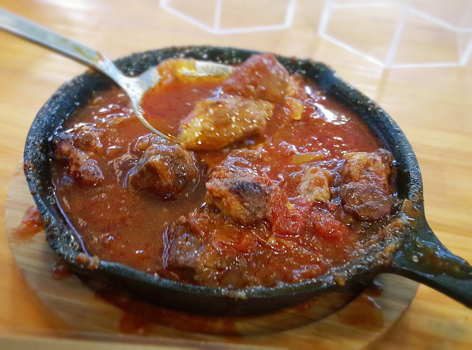 這是兩人份的肉類主菜,非常豐盛。雞腿排酥炸後加上一點橙醬軟嫩可口,脆皮烤豬烤得油亮香氣四溢,羊排肉大塊無羊腥味。但這一盤讓我最驚豔的是旁邊的烤鮮蔬,有櫛瓜和甜椒,是屬於這個時節的作物非常鮮甜,先炒再烤,水分還能保留在蔬菜裡,還有火烤的焦香氣。 脆皮烤豬肥瘦適中,皮脆脆的嚼起來很香。