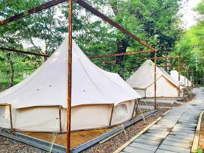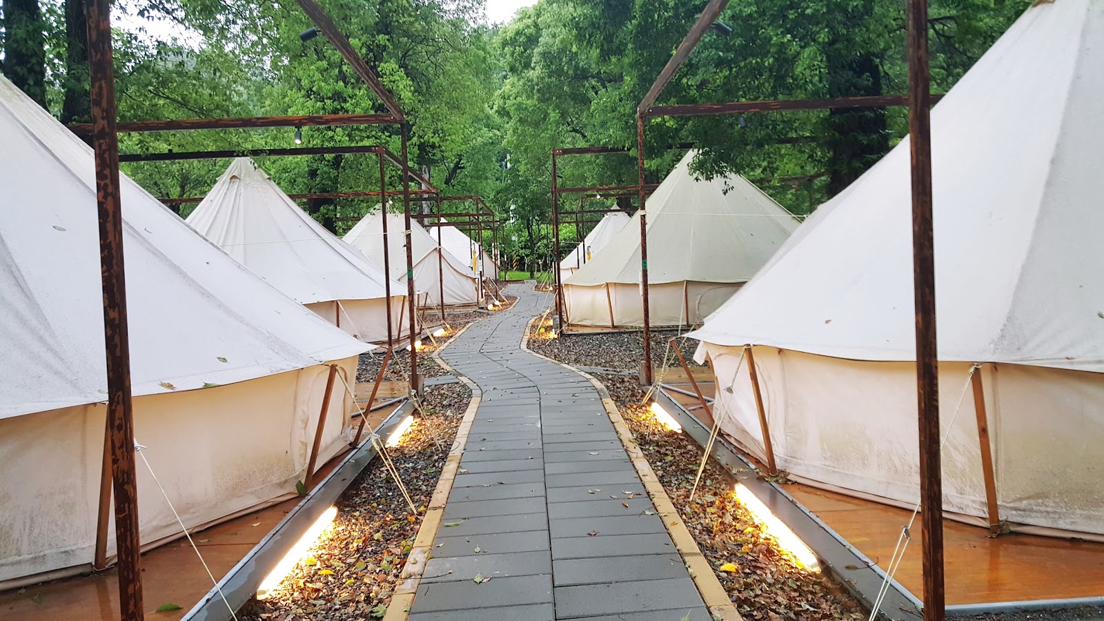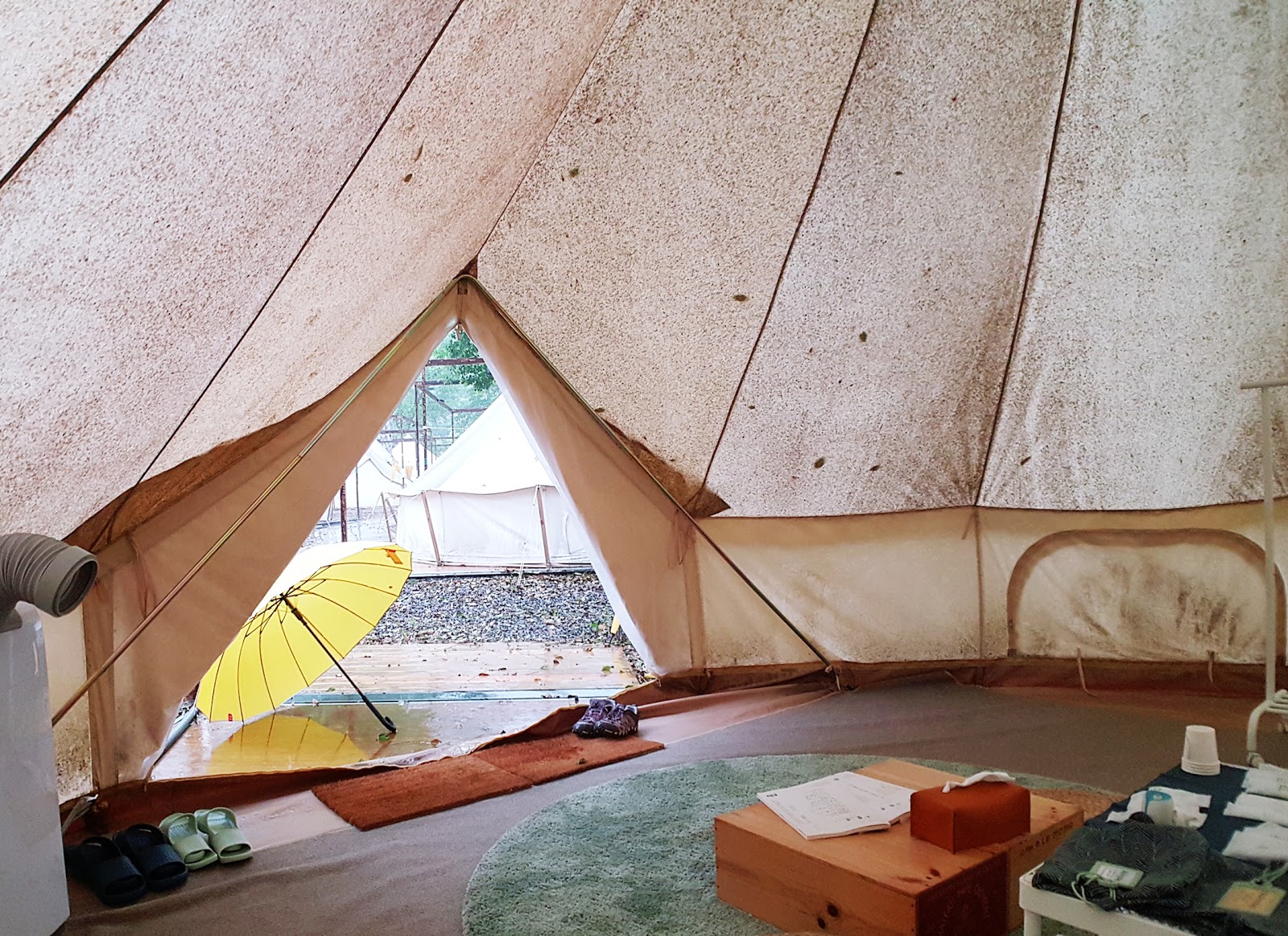 夏日的天空翻臉跟翻書一樣快,雨總是說來就來,園方也貼心在帳篷門口吊了幾把雨傘。就這樣泡杯茶坐在帳篷內放空,聽雨滴答滴答打在外帳,不知為什麼,感覺很平靜。 雷陣雨不一會兒就離開了,雨後的空氣聞起來很清新。