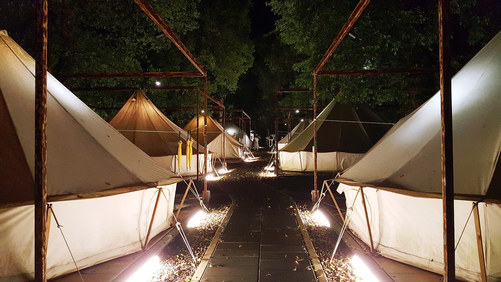 帶著圓滾滾的肚子慢慢散步回營區,晚上的帳篷點起了幾盞暖黃燈,氣氛很溫馨。
