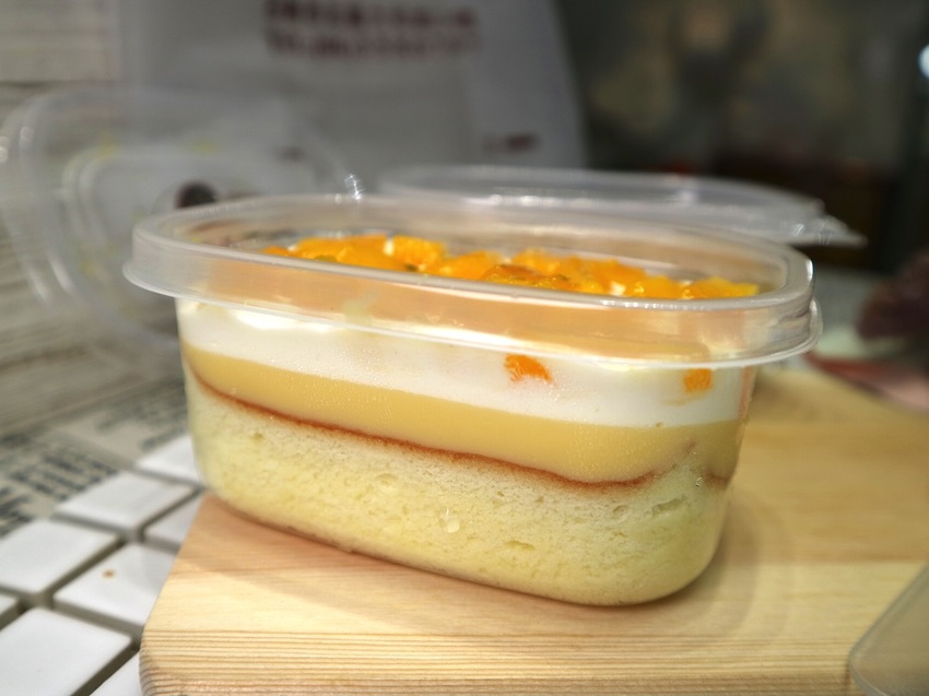 底層原味蛋糕、中間特製布丁、上層法國鐵塔鮮奶油及新鮮愛文芒果 /蛋奶素可食用