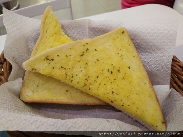 我們人多,點了五份套餐,每份有兩片香蒜麵包,