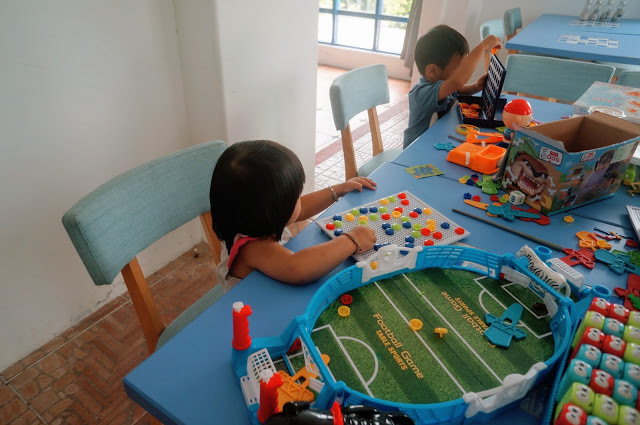 城堡內有著四個區域,分別為櫃檯前端的古典藍沙發區,上面坐著超熱情的熊熊接待員和櫃檯前端放著小迷鹿精心為住客們準備的吃喝玩樂密笈,櫃台右側有著旅遊活動訊息區,另外還有一處靜謐的沙發區,以及我們這兩天最長時間待在這活動的交誼廳,有著孩子們最愛的桌遊區和媽媽們可以放鬆的窗邊桌。