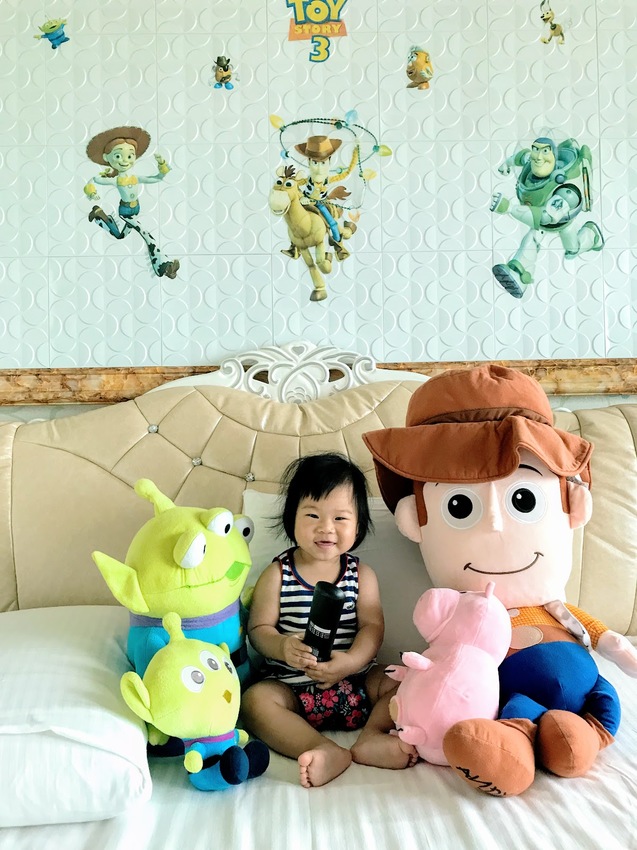 林太和甄寶這日體驗的房型是主題雙人房(童心未泯房),房門一打開就看到胡迪在迎接我們,喜歡玩具總動員的林太這兩日就幫甄寶多照幾張。