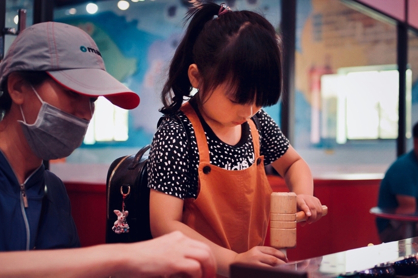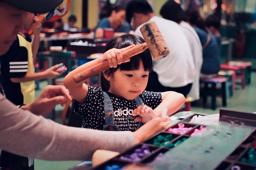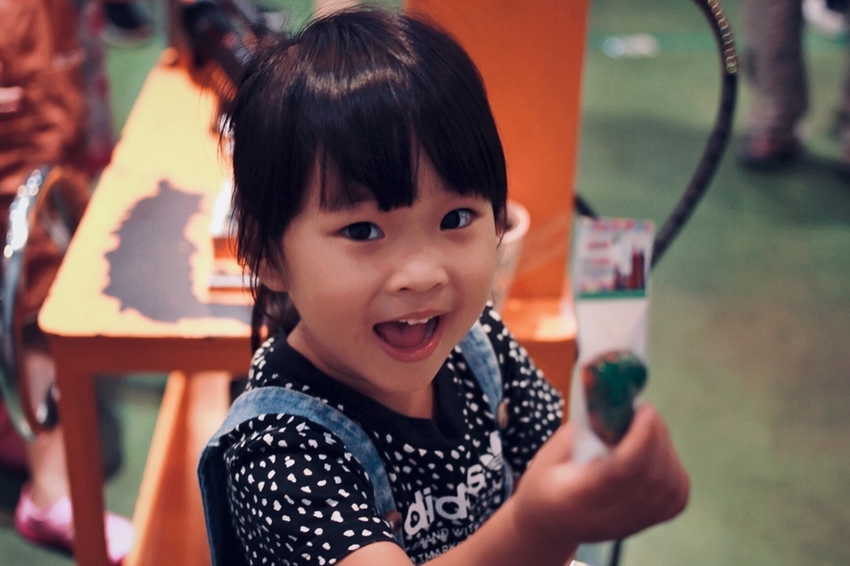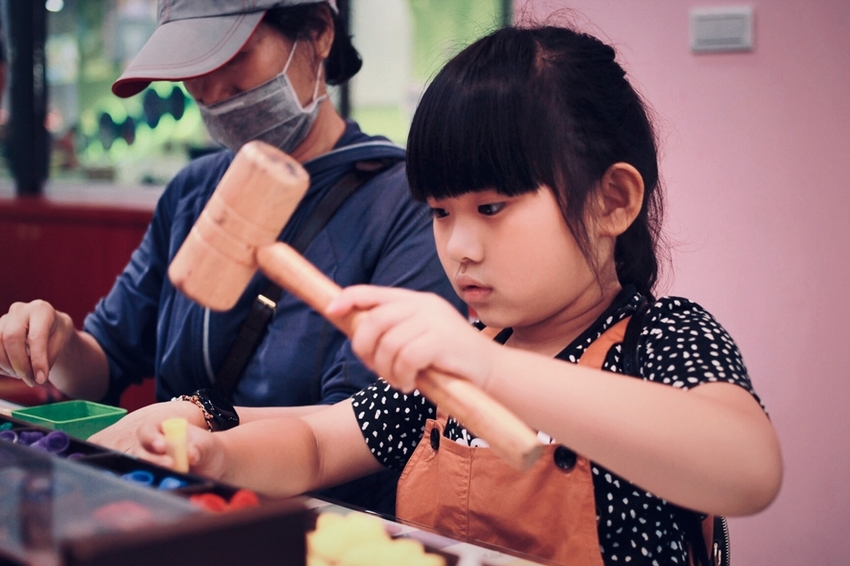 手工製作彩色筆,一樣會有影片教學,接著再自己動手做彩色筆,敲敲打打的,蔬果姐妹玩的不亦樂乎,超開心!一共有6個顏色可以選擇,可帶回3支彩色筆。我們一家四口外加奶奶,一共拿了15支彩色筆回家去。