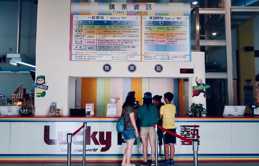 一走進蠟筆城堡,就可看到櫃台售票區,全票200元/人,含入園參加DIY體驗以及消費抵用100元/張,未滿3歲幼童及年滿65歲以上長者是可以免費陪同入園,但就沒有可以DIY體驗。門票上的圖案就是這座繽紛蠟筆城堡,同時還會贈送迷你小蠟筆當小禮物喔!