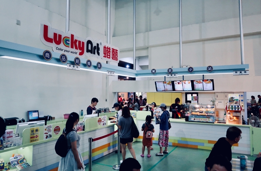最後出口處是蜡藝蠟筆城堡的商品販售區,販售著許多蜡藝的周邊商品、美術顏料、人體彩繪顏料、工具等等,每張門票可以折抵100元消費。黃標商品,可以全額折抵、多張門票累計折抵;藍標商品,只能折抵一張門票;紅(粉紅)標商品,則是不可用門票折抵。另外一旁也有販售炸物、小點心和烤土司、飲料等,肚子餓、口渴都不用煩惱。
