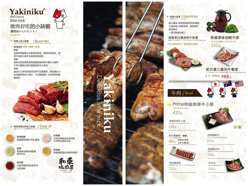 和東燒肉屋隱身在桃園的民有三街上,旁邊就是熱鬧的寶山街,比起藝文特區,咬咬更喜歡這裡的環境,旁邊有公有停車場,車流量及人潮也沒麼多,反而用餐起來比較輕鬆悠閒,和東燒肉屋的店面設計也很可愛,還放有可愛牛牛立牌可以拍照,門口處有貼上和東招牌牛舌七吃的海報,光看界讓人食指大動呢
