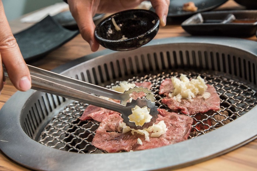 首先烤的是牛五花肉,直接將牛五花至於烤網中央,下去大概5秒內就要翻面,烤的時間不要超過十秒,牛五花肉入口幾乎即化,絲毫不需要咀嚼,肉汁像湧泉般不斷流出