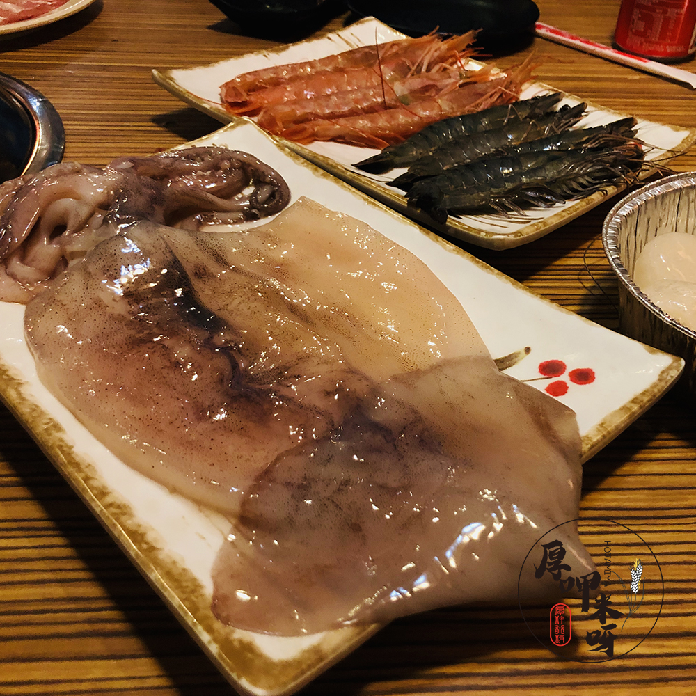 當天我們選擇的是749價位等級的菜色,同行的朋友很愛吃蝦,看到店家有提供天使紅蝦、大草蝦便先鎖定點用,也點了精選肉品、魷魚串、大干貝,基本上都是大家吃燒烤必點的項目,上桌時這些品項的呈現,真心覺得眼前為之一亮,看起來除了新鮮,份量上也給得很大器。