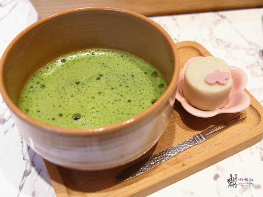 很可愛的茶碗搭上白豆沙和果子,一整個好萌,好適合假裝自己在日本的打卡。白豆沙餡的和果子充滿白豆沙的細緻口感和香氣,綿綿細細的,稍稍甜了一點,要一口和菓子一口茶,風雅的把他吃完。不要跟阿寶一樣,好像吃雞蛋糕配珍奶,幾口吃光光…浪費!