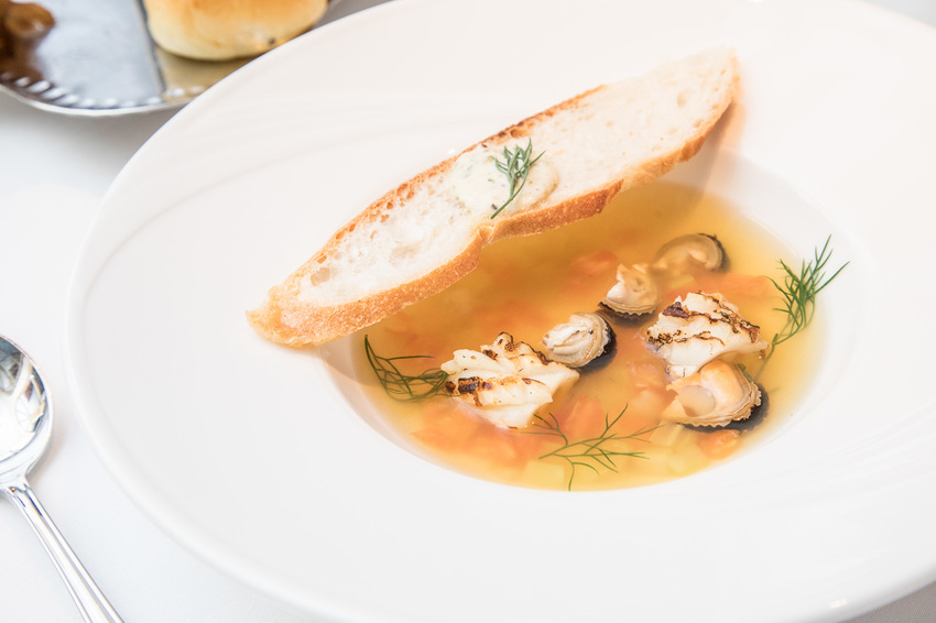 以法式澄清湯的做法呈現,看似清爽的湯頭蘊藏了極為濃郁的海鮮滋味,新鮮小卷炙燒提升香氣口感,伴著海鮮料一起入口,口感相當細緻