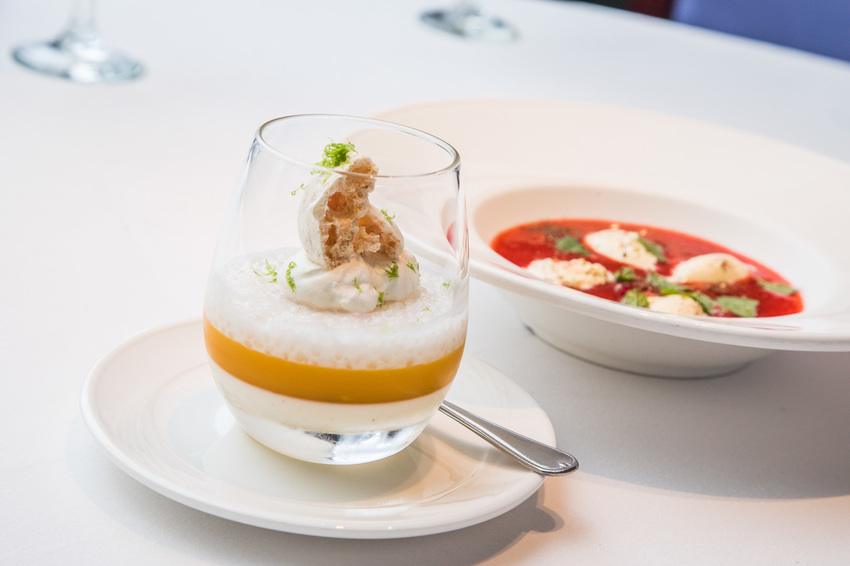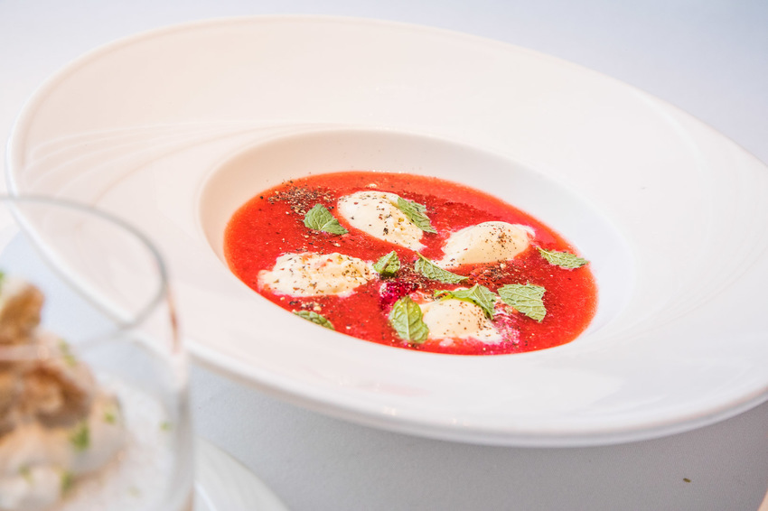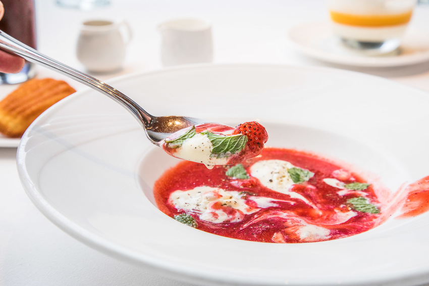 新的創意甜點,剛看菜名其實有點摸不著頭緒,胡椒?草莓?!這湯是甜的還鹹的,外觀看起來像湯,入口確實是甜點的味道!使用新鮮的草莓打成果泥、還可以吃到新鮮草莓丁,撒上現磨胡椒顆粒、搭配清香的薄荷及香草冰淇淋,冰淇淋拌著草莓濃湯一起吃,胡椒的辛湘氣息更讓草莓的甜度酸香凸顯,讓湯嚐起來更有層次!