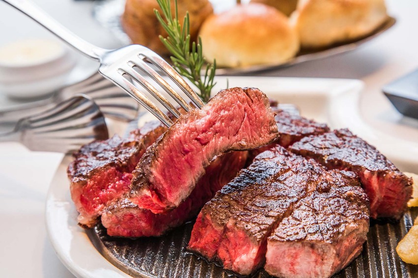 整塊神戶肋眼牛排在燈光的照射下,焦香的外層正點綴著閃閃金光,三分熟生不帶血,內部均勻條狀黃帶白的油脂清晰可見,可以預見待會入口後噴發的肉汁有多豐富