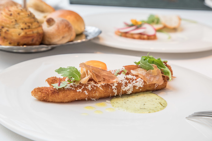 白蘆筍現在應該是星級飯店中最夯的食材,地中海牛排館特別挑選自雲林本土白蘆筍,以油炸的方式去除白蘆筍的特有苦甘味,麵包粉也是用自家麵包特製,酥脆不含油,配上白蘆筍的爽脆水嫩的口感,加上生火腿的鹹香及濃稠半熟蛋黃,口感味覺都極富層次