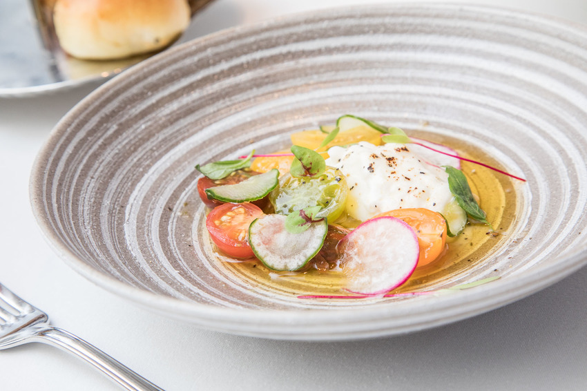閃耀著光芒的七彩番茄落入盤中,猶如田園中的珠寶盒一般,每一顆番茄都有自己獨特的香氣及果酸甜味,搭配上羅勒油及布拉塔起司讓果酸香氣更加圓潤融合,清爽開胃