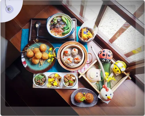 港式點心讓我們覺得非常用心呢!有質感的日風餐具和木盤,美麗的鮮花點綴,讓下午茶時光變得更加愜意。