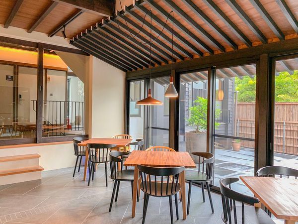接著是大片落地窗內,媲美日式文青咖啡廳的交誼廳,也是早餐用餐的地點,整體的設計、採光都非常優秀,帶著筆電,或是選一本書架上的書,就可以享受悠哉的午後。