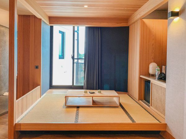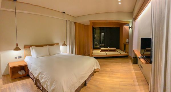 可以看到他的衛浴採半開放式的,因此整個房間都可以找得到陽光,跟我們住的根房間比起來,白天幾乎都不用開燈,所以房間的燈飾比較少,不過這間同樣也是檜木設計但是房間的味道跟我們那間不一樣!問了管家才知道原來是因為較多陽光照射到褟褟米,所以這間陽光充足的房間才會有較濃的褟褟米味,真的是長知識了呢!