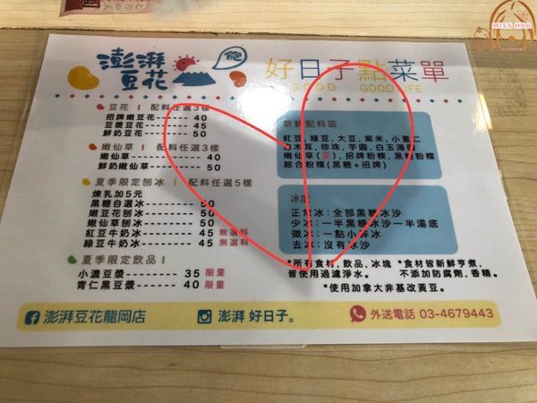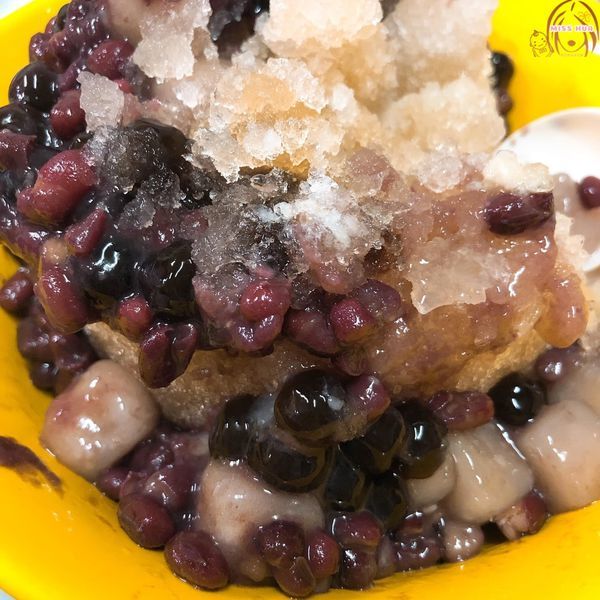 配料:紅豆、綠豆、大豆、紫米、小薏仁、白木耳、珍珠、芋圓、白玉湯圓、嫩鮮草、招牌粉粿、黑糖粉粿、綜合粉粿(黑糖+招牌)