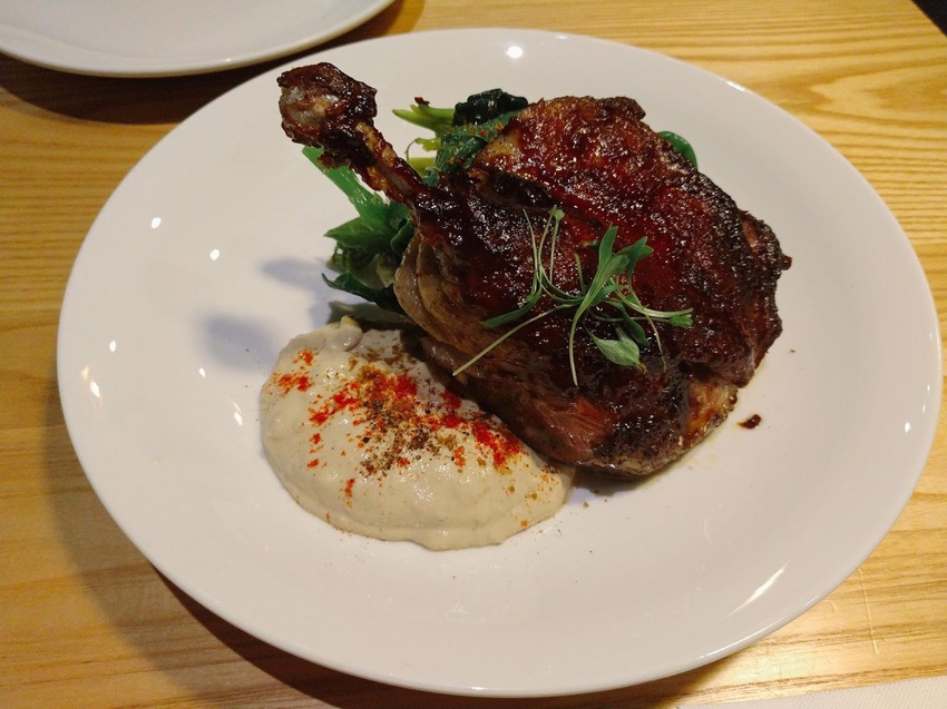 本次來訪的目的是幫美食家友人赴美工作踐行,因此服務生建議兩位用餐的話,可以點三道菜:一道前菜、烤肉、咖哩(剛好也可達到低消)。擺盤也相當精緻,上菜速度還算可以,不像坊間所言。前菜我們選的是味道頗具有衝突感雞肝肉凍與香料芒果沙拉,因為雞肝的味道重,需要和咖哩香料的芒果攪拌吃,雖是蠻特別的啦,但筆者也是繼之前台式法吃的桌藏「台式蘿蔔糕微烤法國鵝肝醬」,與這次的經驗後,已確定自己不適合吃肝類的料理...(延伸閱讀:款待之心:臺菜法吃的跨界體驗)
