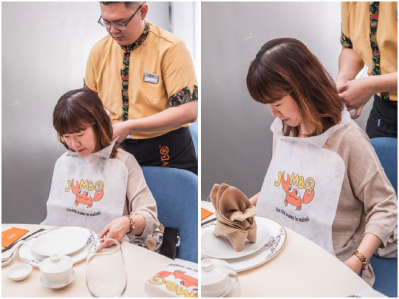 貼心的還不僅如此,珍寶海鮮在用餐前,服務生會貼心地幫大家圍上圍巾,在剝螃蟹的時候就不用怕醬汁噴濺在衣服上囉!
