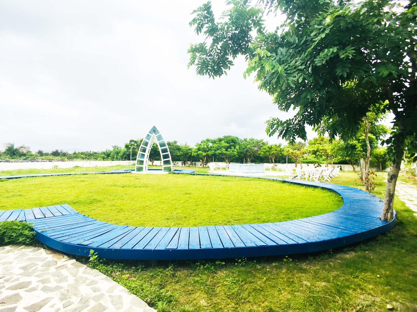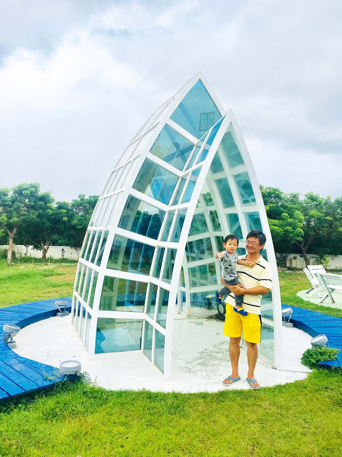 建築後方的寬廣庭院種植有美麗的草皮和各式花草,海風輕拂綠意,無論是在搖椅上輕輕搖晃,或是在水晶教堂前拍張網美照,都相當愜意,也可以請服務人員在戲水池裡放水,和家人朋友打場刺激的水仗!