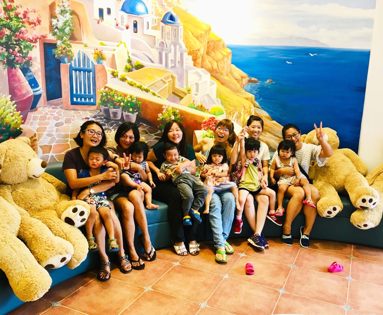 沙發上的四隻大熊娃娃很吸睛,小福寶好喜歡牠們,經常又摸又抱,地中海風情的壁畫也是房客常拍照打卡的熱門景點。