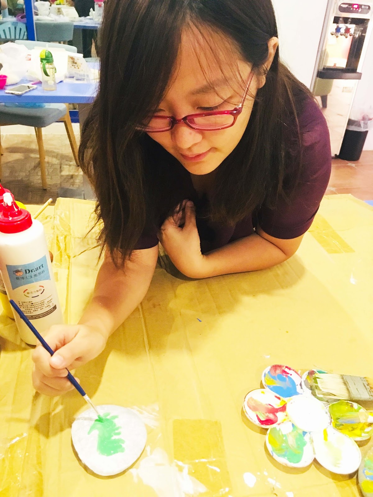 沒想到看似單純的石頭彩繪DIY,大家一起玩卻是這麼有趣,看到同行媽媽和孩子發揮創意,塗抹粉色漸層、花朵、豬鼻子...等,覺得又更認識大家了。