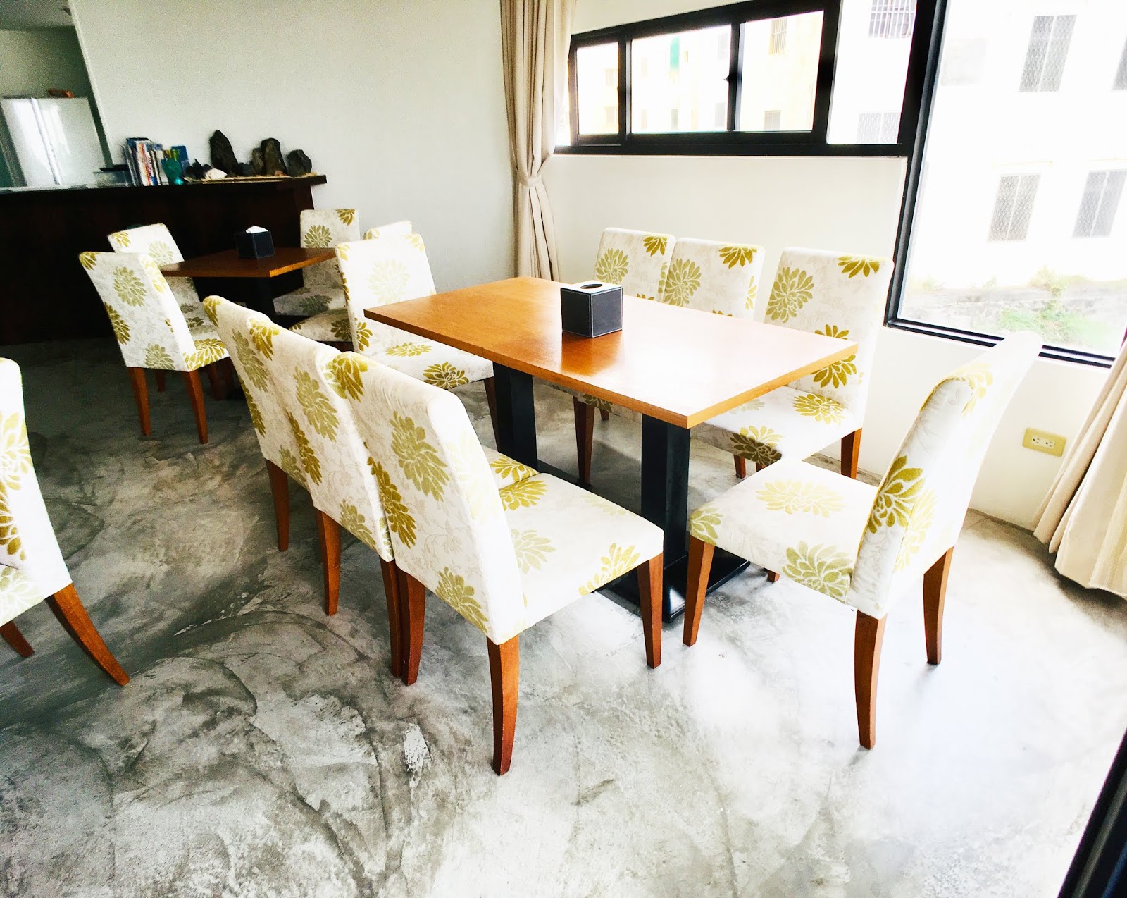 進入挑高的大廳,櫃檯旁弧形的木格柵與門前的半圓延伸為完整的一個圓,大面玻璃窗將陽光引入廳內,帶來一室的溫馨舒適,真的是「沐浴在光中」。