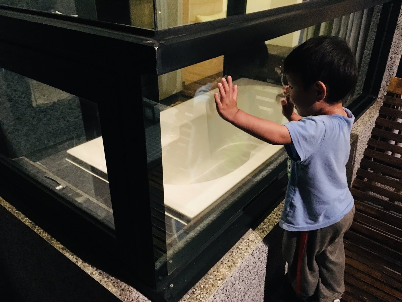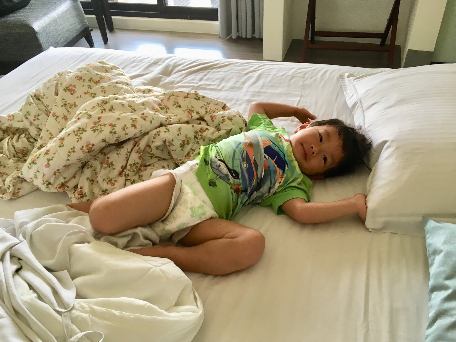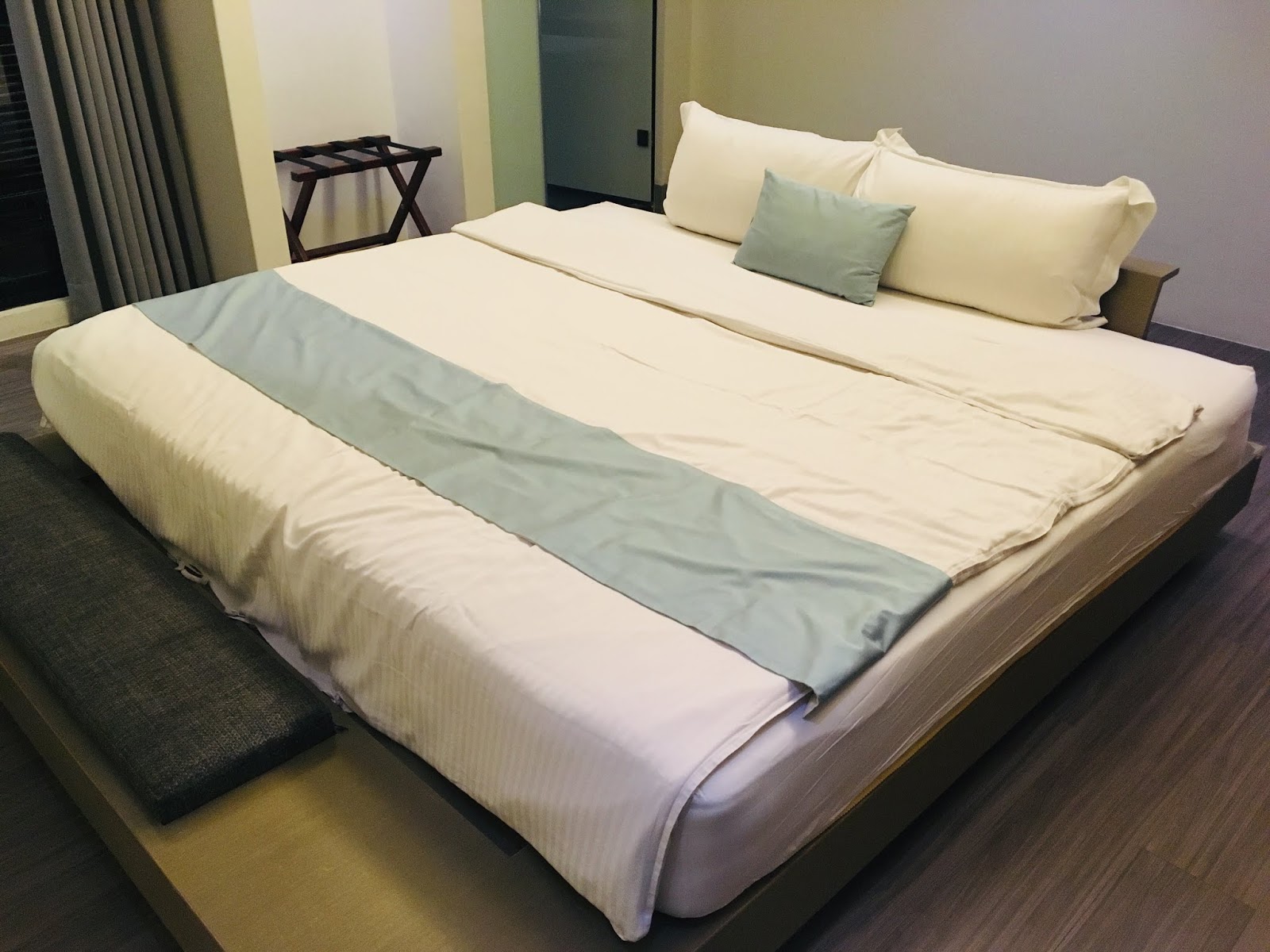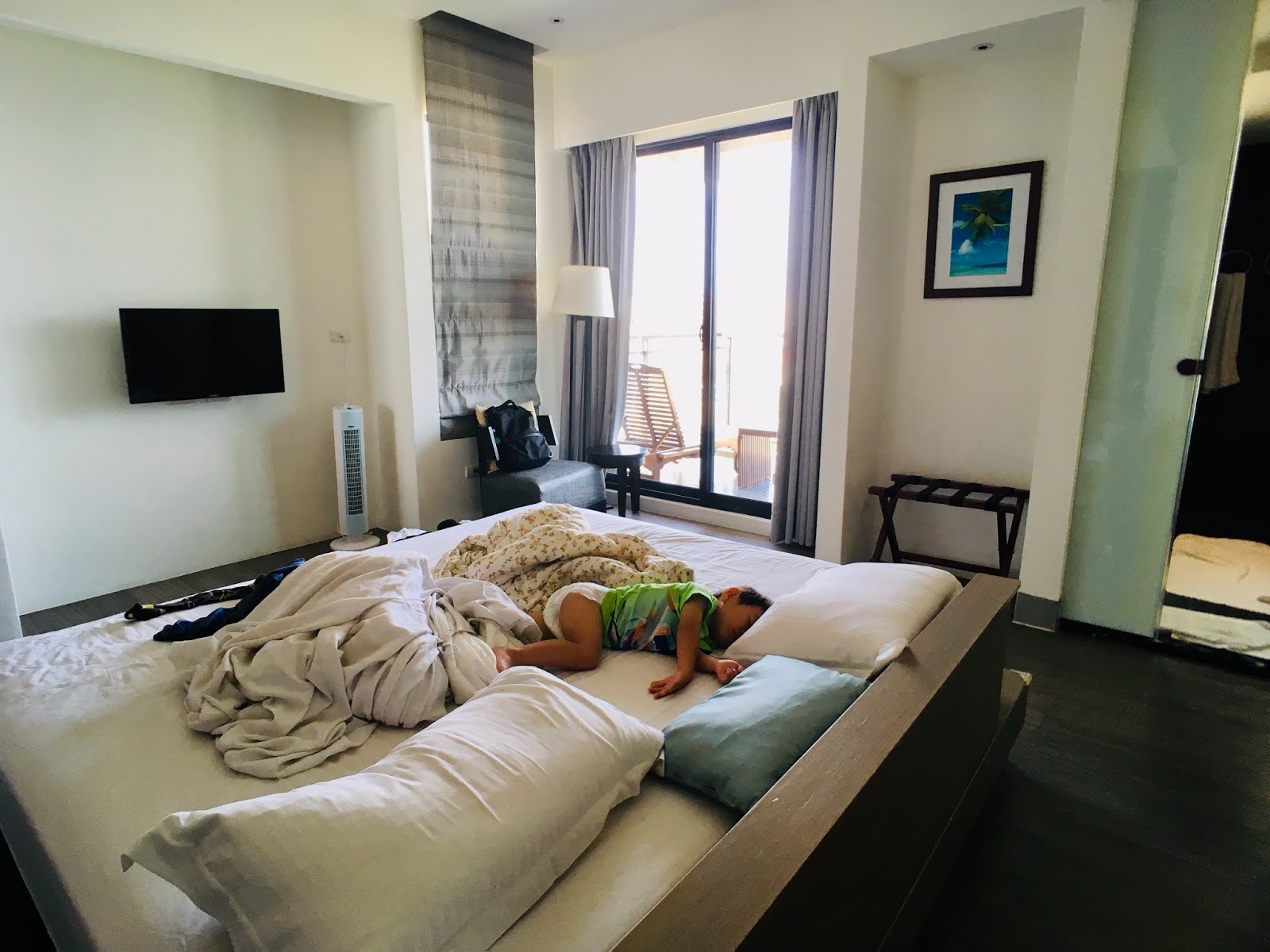 套房設計讓我們很驚喜,房間的正中間就是床鋪,床鋪四面都不靠牆,反而有種兩人相依的甜蜜感,在床上就可以看到窗外的海景,視野很好。(只是因為我們帶著小福寶,怕他滾下來,後來還是將床靠在衣櫃旁,爸媽才能放心入睡。)
