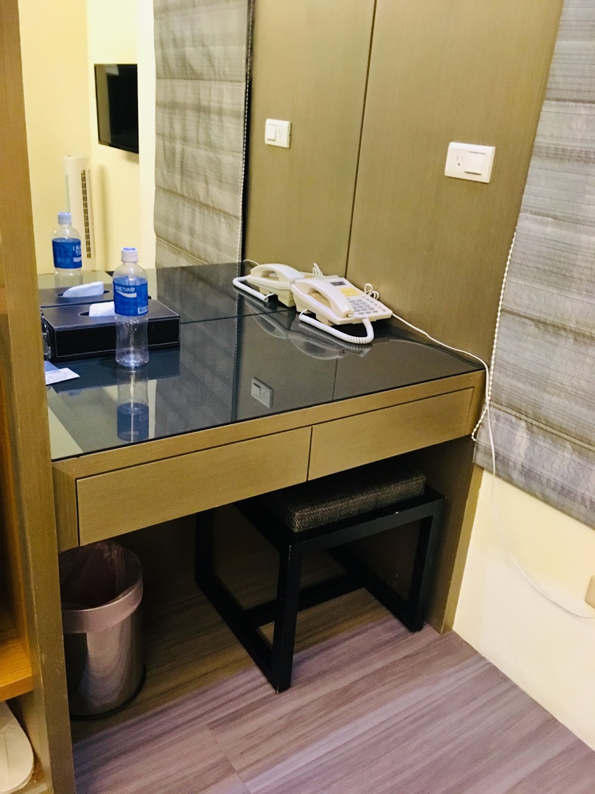 衣櫃裡的衣架數量充足,有備用枕頭和棉被可使用。桌上有茶包、咖啡、運動飲料、礦泉水,最貼心的還有已經煮好的大壺開水,也可以用熱水壺自己煮水,選擇很多。冰箱和吹風機都有,生活用品一應俱全。