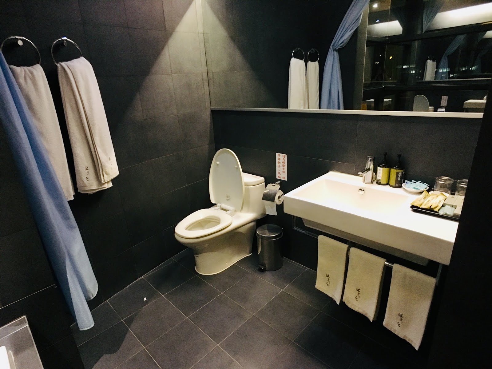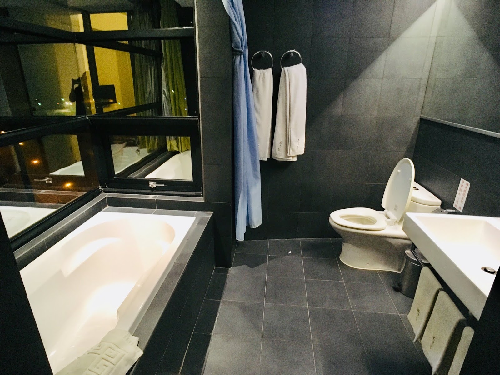 浴室是以浴簾做浴缸和廁所的乾濕分離,浴缸旁的大面窗戶可以看到街景與海景,若是日落時邊泡澡邊看夕陽,再一杯紅酒香檳,就是人生中一大享受了。