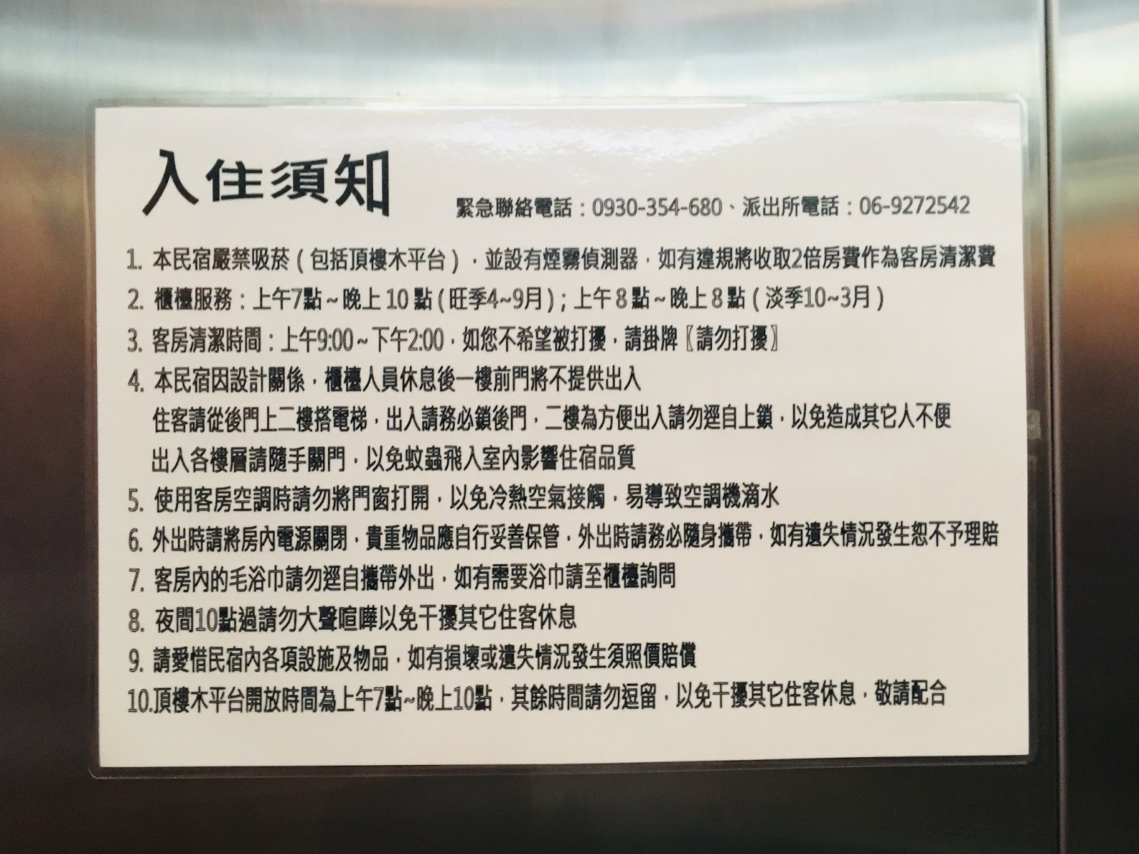 電梯門口和電梯內都有「入住須知」,要記得晚上10點後不要大聲喧嘩,旺季入住時間為下午3點到晚上9:30,最晚上午11:00前退房。