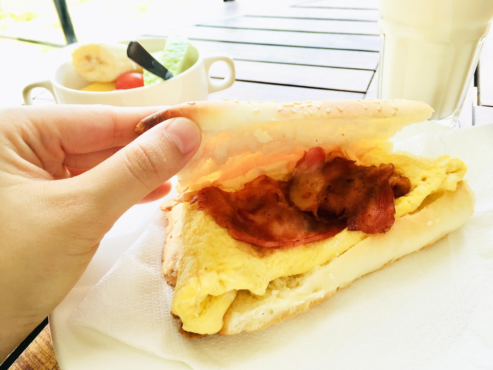 民宿用心供應一人一份手作早餐,有酥脆燒餅夾培根烘蛋、營養滿分的綜合水果和扎實濃郁的豆漿,吃得很飽足又健康。我們特別喜歡中西合併的燒餅,香酥中的焦香、軟嫩,是讓人難忘的美味。