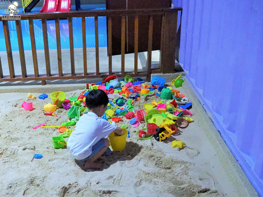 可以先帶小朋友躲在室內玩水、玩沙唷!