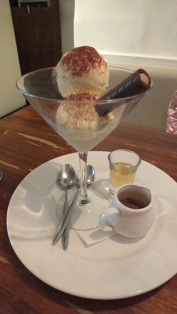 高腳杯中有兩球香草冰淇淋+捲心餅