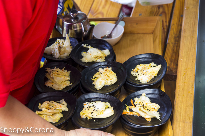 每人會有一份泡菜和醬汁還有黑色與綠色的筷子各一雙,