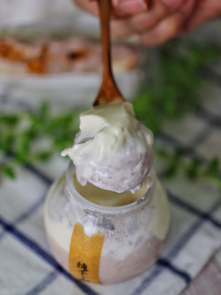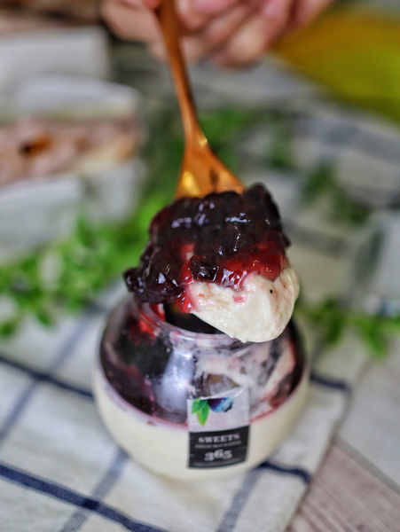 ▫好吃的奶酪也有單獨販賣(需預訂),圓滾滾的造型瓶超可愛,沒有太多吉利丁、是入口即化的清爽感,鮮奶味香醇簡單。藍莓醬可以吃到果肉的紮實度可見用心,季節限定的芒果塊也很MATCH,或者推薦你買原味回去搭配自己喜歡的水果。私心最喜歡的還是芋泥奶酪,大手筆裝入將近半罐的芋泥,一輪吃下來,直接湊一套芋泥餐啦!