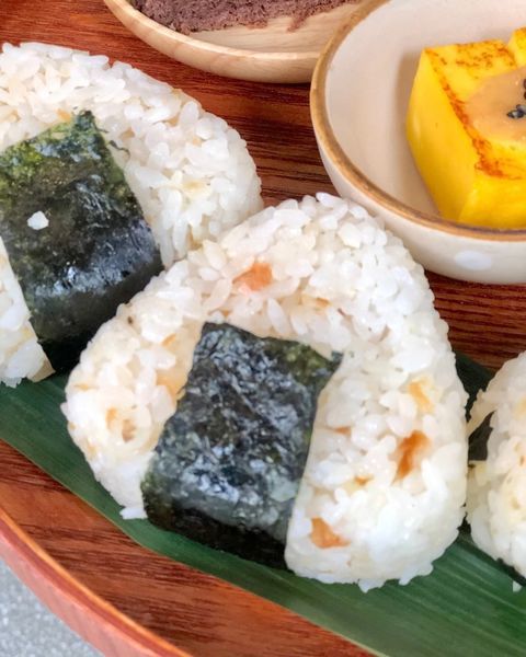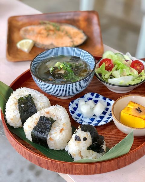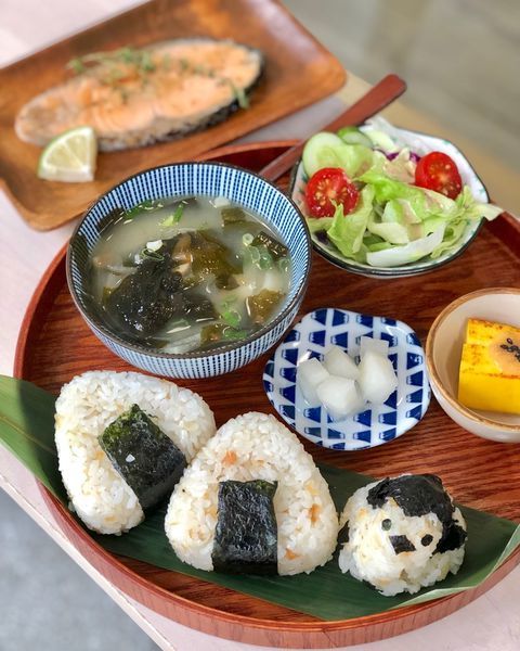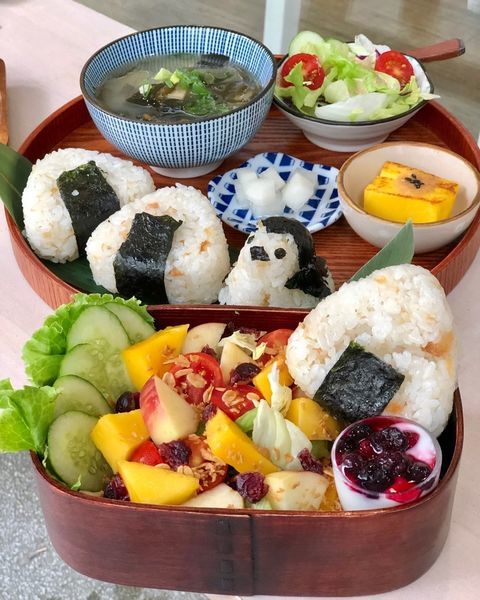 一顆三角飯糰搭配上各式水果跟蔬菜