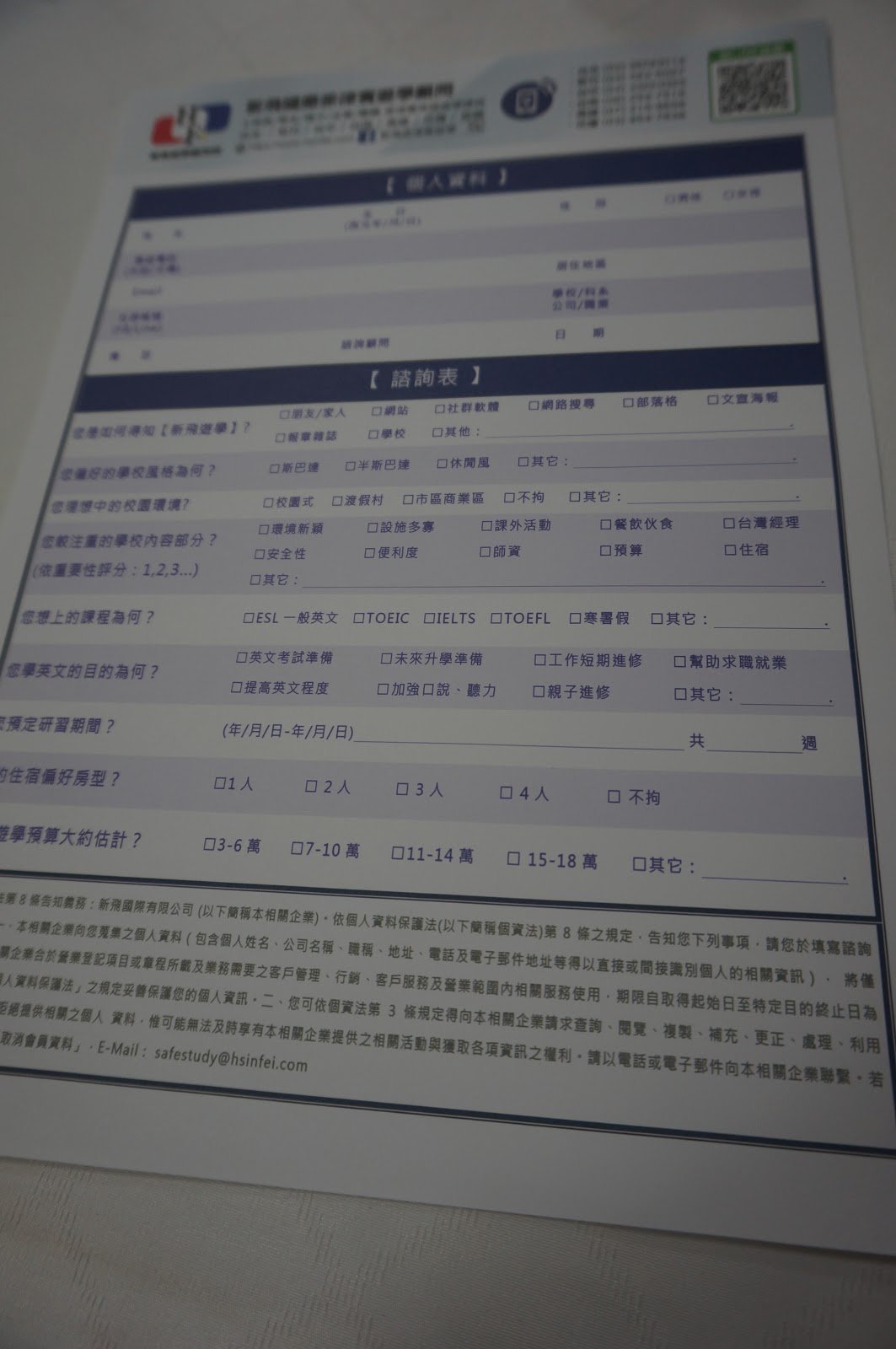 美麗親切的代辦人員Elly,先讓屎蛋媽填寫【遊學諮詢表】包含學習需求,新飛遊學專業的語言學校有ESL一般英文、TOEIC、IELTS、TOEFL等各種英語課程,以及依學習目的如提升英語程度、未來升學準備、工作短期進修、親子進修等來規劃海外遊學課程。