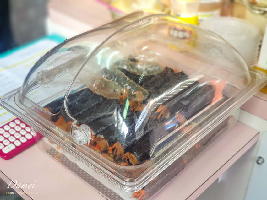 小飯卷裡包覆著黃蘿蔔,口感很脆,另外還有加魚板。