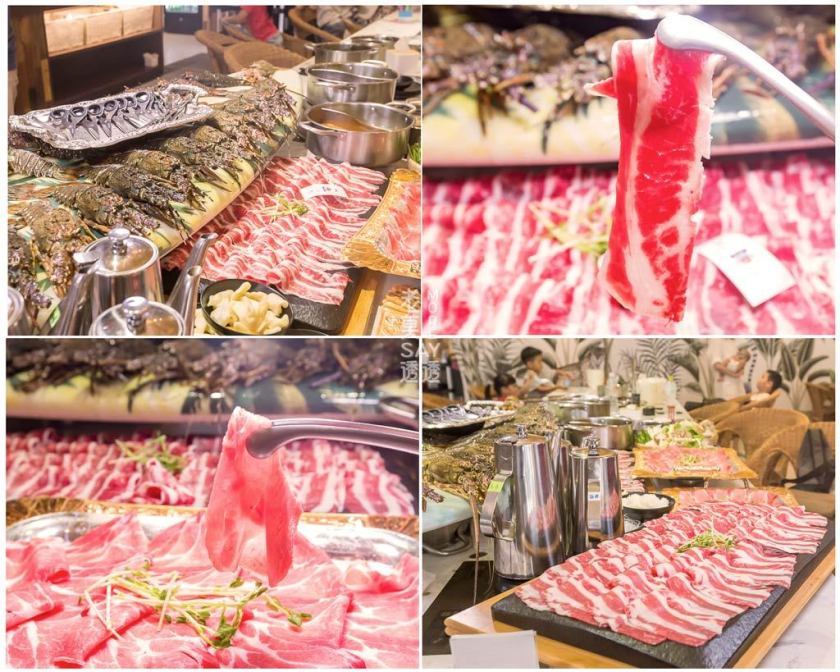 ↳除了28隻龍蝦外,另外還有48盎司的霜降牛以及菜盤可換成梅花豬,肥瘦比相當均勻的霜降牛肉,稍涮個幾秒入口,口口都是濃郁的牛味。