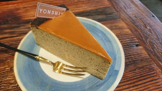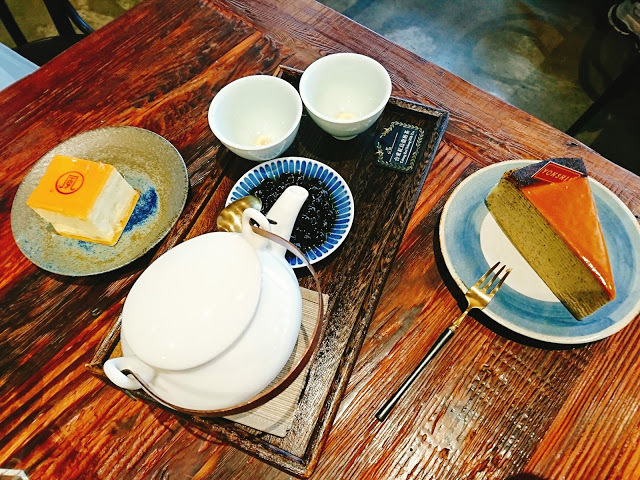 珍珠奶茶的左邊是柴燒桂圓乳酪蛋糕,