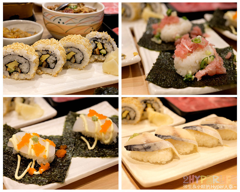 既然是日式吃到飽,免不了來一些壽司。這四種都好喜歡:醋鯖魚握壽司 、花枝手捲、其中我們很喜歡右上角的壽司蔥花鮪魚泥手捲壽司、還有左上角的鰻魚芝麻卷壽司,這個夏天必吃!