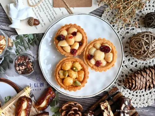 整個塔皮奶香味很明顯外,夏威夷豆還有夾了些許的蔓越梅乾再以麥芽糖包裹整顆豆塔。