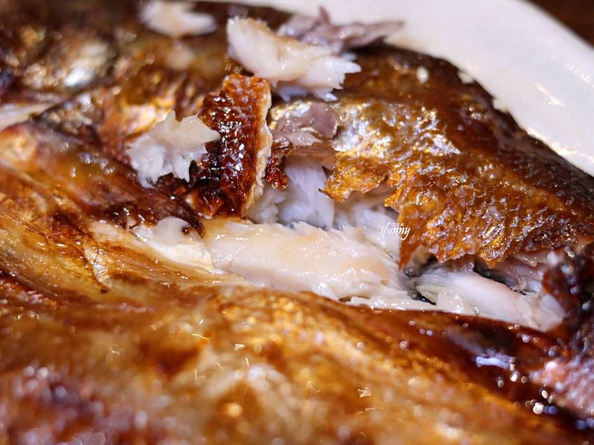 烤到金黃酥脆的魚皮帶著脆度,豐腴肥美的魚肉細緻鮮香,帶有淡淡的柑橘味及清酒香氣,軟嫩多汁的滋味實在是太迷人了!
