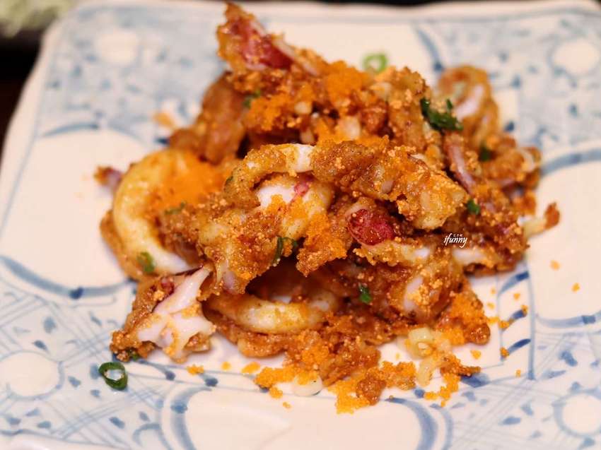 將魷魚裹粉後炸得金黃酥脆,再加入明太子及辛香料拌炒,將鹹香有味的明太子完全巴附在魷魚上。具有嚼勁的魷魚,越咬越發香氣及口感,最適合來杯暢快的啤酒了!