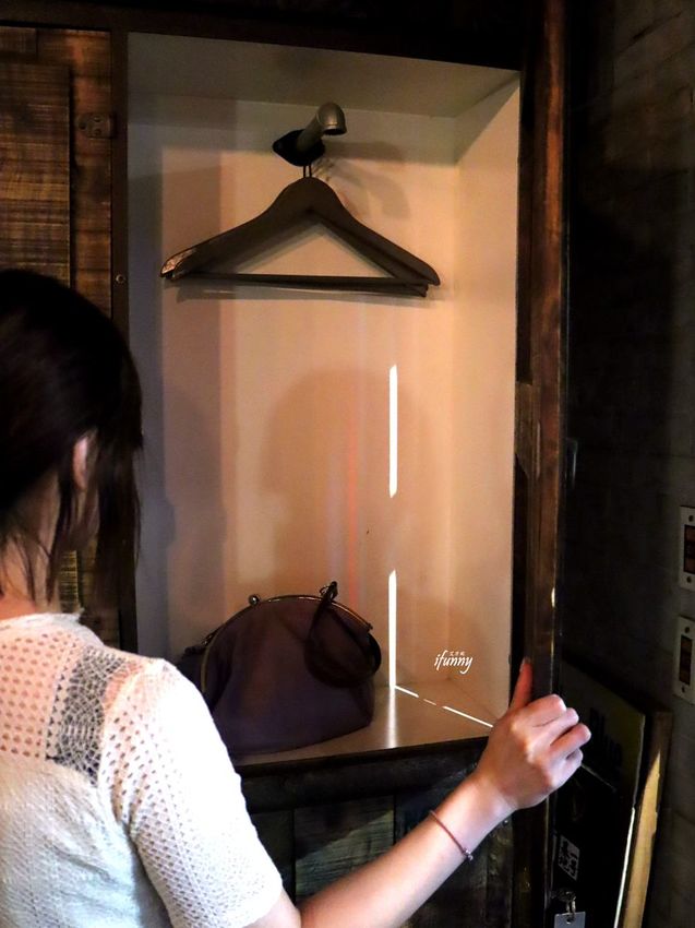 利用鐵鍊當作隔間分成座位區及走道,鐵鍊上正好放衣架,也是挺方便的設計。