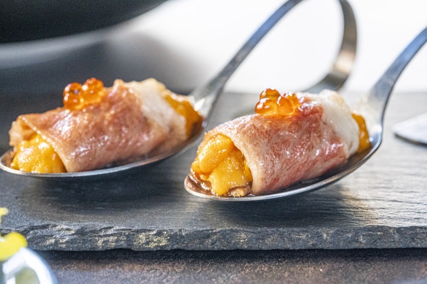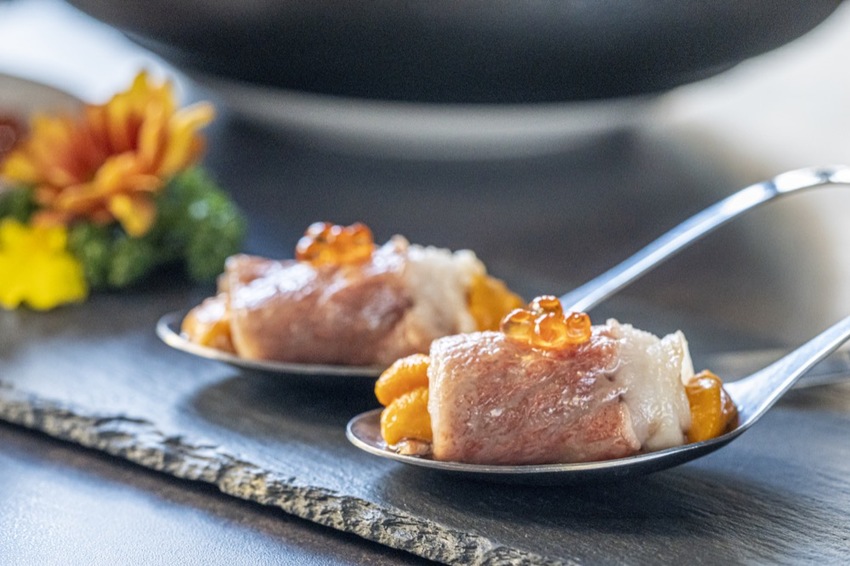 先由前菜說起,首先上桌的是和牛海膽捲和隱藏版前菜!將和牛炙燒至淡粉色,並裹入日本赤上海膽及鮭魚卵點綴,濃郁肉脂和海鮮甘甜相互交錯,柔嫩的口感搭配鮮甜滋味讓人難以忘懷~(幸福)