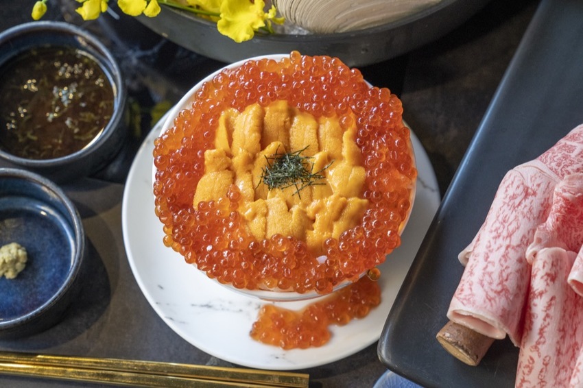 副餐也是有夠浮誇~在拌入和牛牛油的白飯上鋪上滿滿的鮭魚卵和海膽,不只能嚐到魚卵鹹香和濃郁海膽,尾韻更富有油脂鮮甜香氣,口口奢侈滿足!